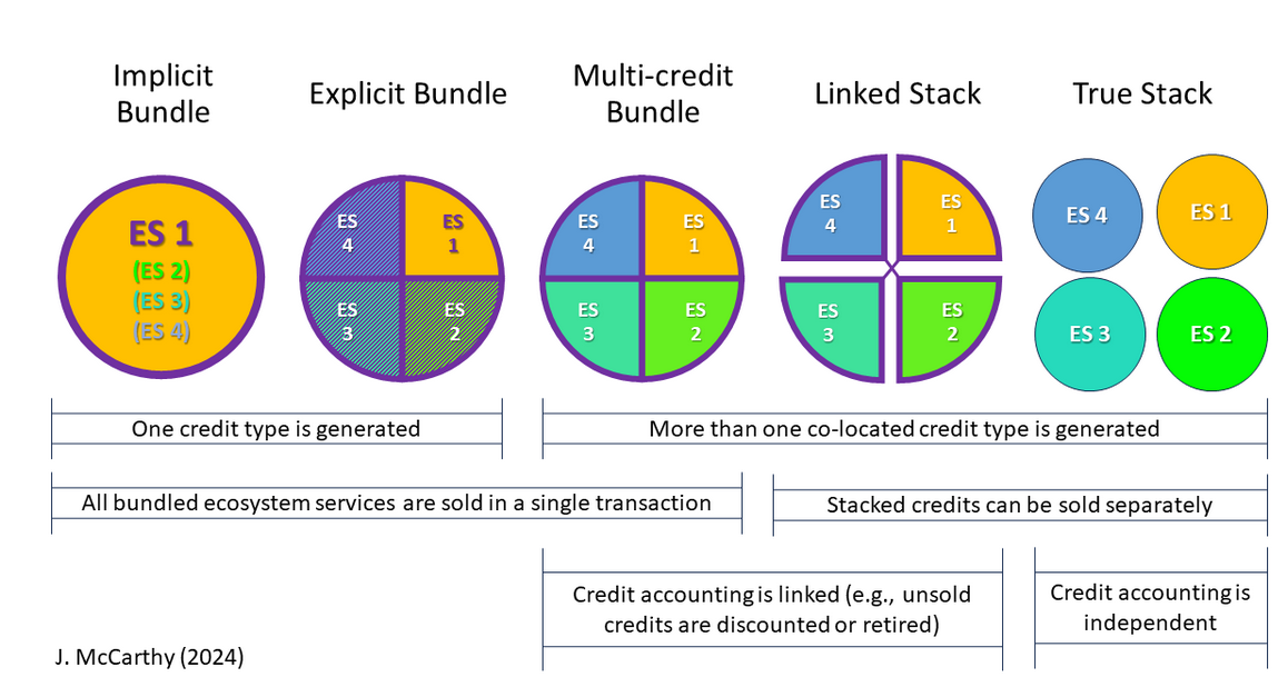 As we dive in further, the lines seem to blur, and what is emerging in practice does not always fit neatly into the boxes of a bundle or a stack. The variability in practice can be distilled into 1) whether ecosystem services are defined as separate credits, 2) whether those credits can be sold separately, and 3) whether stacked ecosystem services are unbundled and accounted for independently.