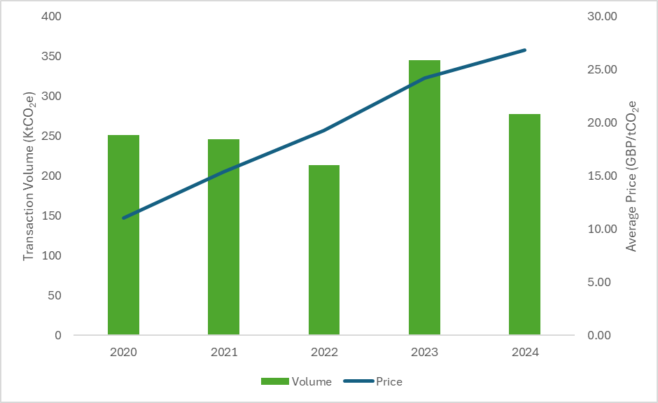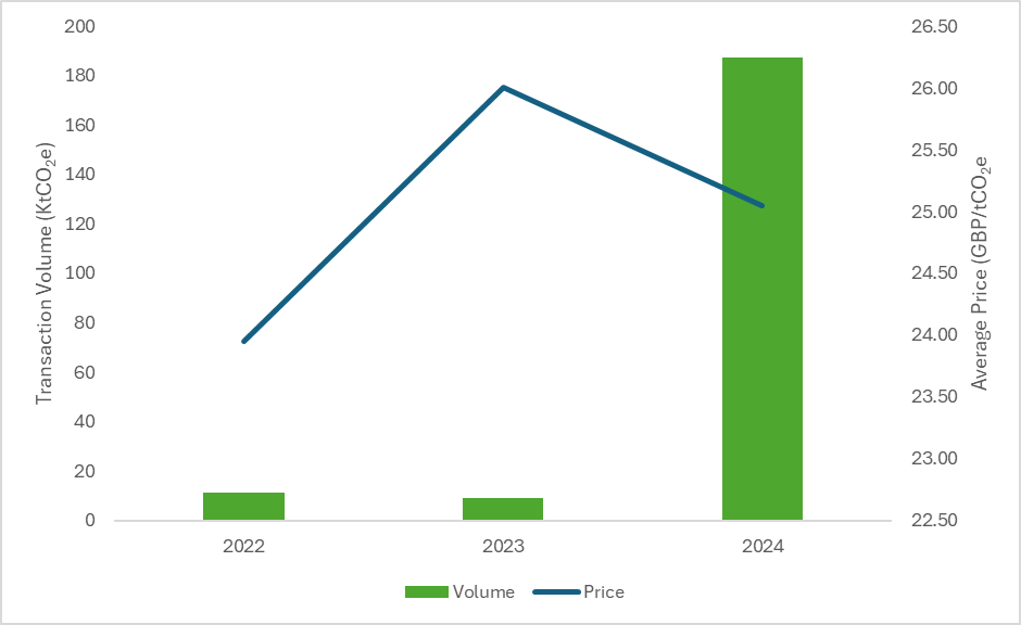| Transaction Year | Volume (tCO2e) | Average Price (GBP/tCO2e) | Price Spread (GBP/tCO2e) |