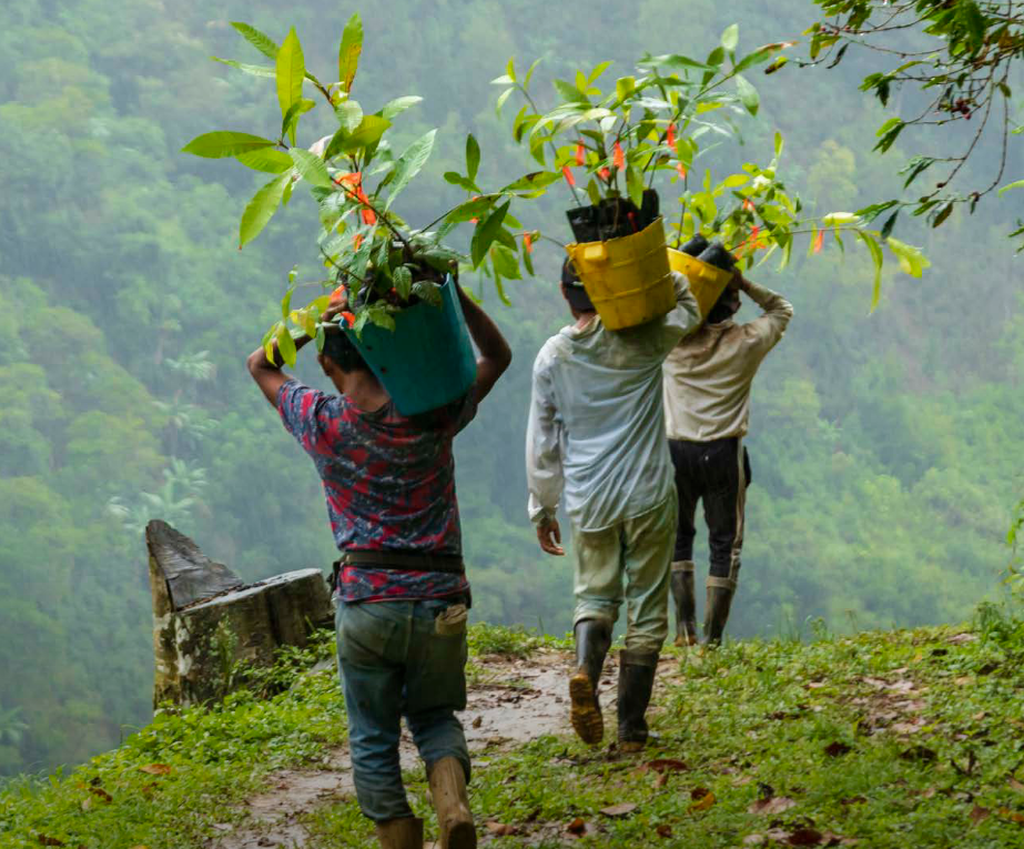 Transporting seedlings to planting sites as part of the Guandusaca and Palmichal Micro-watershed Restoration Project, San Pedro de La Sierra, Magdalena, Colombia. Photo credit: Corporación Paisajes Rurales (2021). Submitted by WWF-Colombia.
