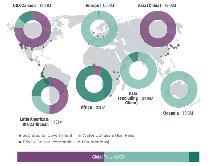 User-driven Investments in NbS for Water by Payer Type and Geography, 2023. Source: Forest Trends and The Nature Conservancy, 2025.