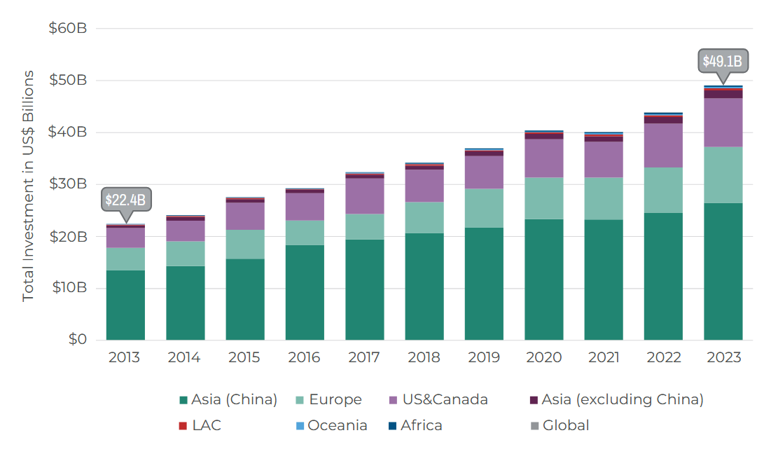 Growth in Investment in NbS for Water Security by Geography, 2013-2023. Source: Forest Trends and The Nature Conservancy, 2025.