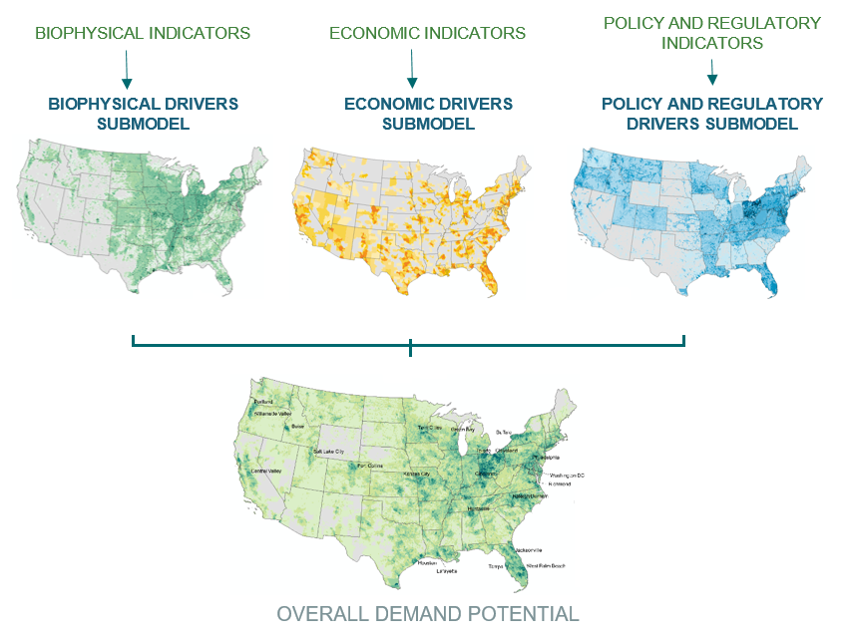 First, we looked at factors we know to be present in programs that are active today. An area must, for example, have a water quality problem that is fixable through trading, so we looked for watersheds with high levels of pollution coming both point sources (like industrial facilities or utilities) and nonpoint sources (like farmland). There must be actors who would purchase potential credits. In many cases, those may be utilities, especially those that are stretched beyond their current treatment capacity and are expecting their water quality challenges to continue grow with increased population and urbanization. We also accounted for policy/regulatory factors, like whether or not an area has water bodies that are listed as “impaired,” where the EPA is authorized to assist states develop plans to improve water quality. If a state already has a trading policy or guidance in place, that can encourage potential buyers to participate. In all, we identified 11 factors, organized into biophysical, economic, and policy/legal sub-models.