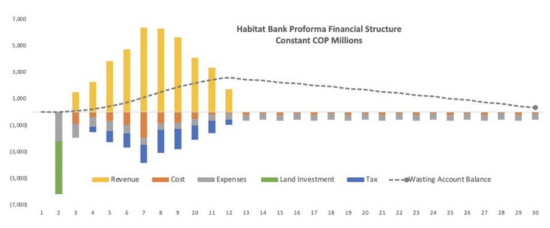 There are many design features that are critical to make private habitat banks effective. We have summarized here how they operate in Colombia. Others have summarized their features in other countries. The simplest way to describe habitat banks in Colombia is that private companies with biodiversity management experts on staff identify strategic locations to invest in large-scale conservation and restoration projects. The bank generates compensation credits from that work that can be sold to development projects. This model operates on a pay-for-results basis over a 30+ year period, utilizing a sinking fund that is vested over 15 years to ensure long-term ecological stability. All costs including obtaining land use permission, payments for landholders, labor and supplies are bundled into the cost of credits.
