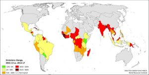 Driving the deforestation is a continued expansion of agricultural production, especially palm oil in Southeast Asia and soy in Latin America, although forest fires in the Amazon also took their toll, as did hurricanes in the Caribbean. Ironically, the advent of peace in Colombia also contributed to the rise in deforestation as it made the forests safe for agriculture.