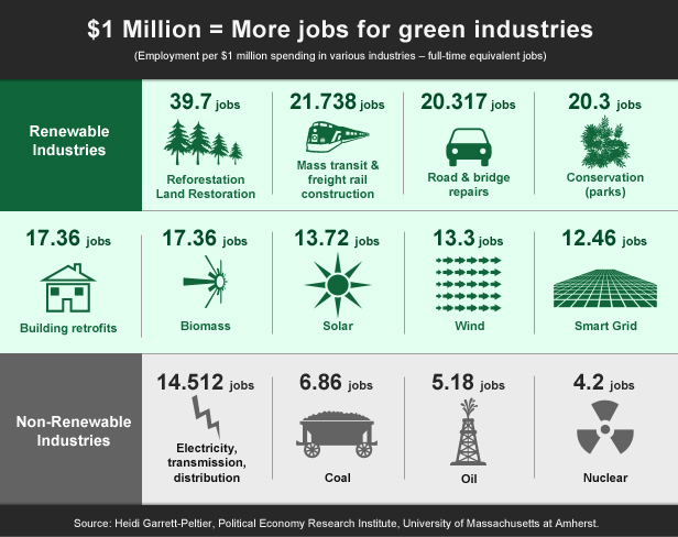 Because restoration work is labor-intensive, the money goes to people instead of machines, and every $1 million invested generates 33 jobs on average. Every $1 million invested in oil, on the other hand, generates 5.2 jobs per $1 million invested. In coal, the figure is 6.9 jobs.