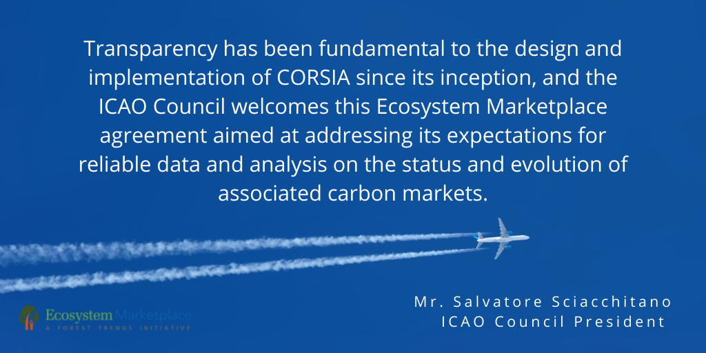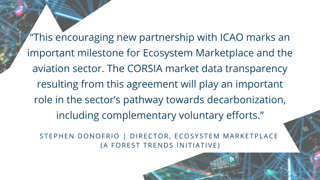 “This encouraging new partnership with ICAO marks an important milestone for Ecosystem Marketplace and the aviation sector,” said Stephen Donofrio, Director of Ecosystem Marketplace. “As CORSIA is a global scheme governed by a regulatory compliance model, the market data transparency resulting from this agreement will play an essential role in the sector’s pathway towards decarbonization, including complementary voluntary efforts.”