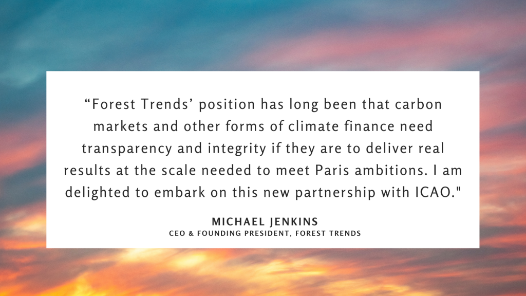 “Forest Trends’ position has long been that carbon markets and other forms of climate finance need transparency and integrity if they are to deliver real results at the scale needed to meet Paris ambitions,” said Michael Jenkins, CEO and Founding President of Forest Trends. “I am delighted to embark on this new partnership with ICAO.”