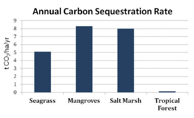 Mangroves are especially suited for carbon capture because they pile most of their carbon on the ocean floor, while terrestrial forests keep most of it in trees and branches.