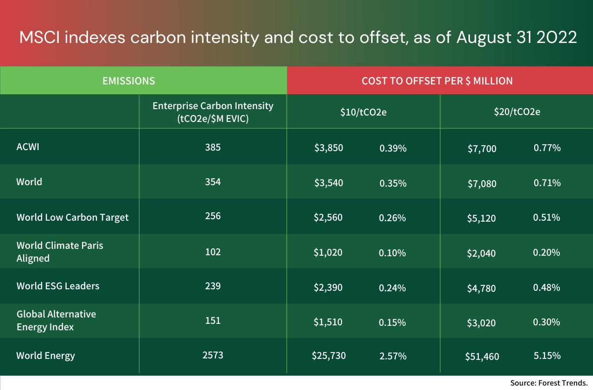 The table below shows the emissions (Scopes 1, 2 and 3) associated with a range of MSCI indexes measured as tons of CO2 equivalent per $ Million of Enterprise Value including Cash (EVIC), as at the end of August 2022. At what would currently represent a high carbon credit price of US$20, the leading MSCI ACWI index would cost 0.77% per annum to offset, the Global Alternative Energy Index 0.30% and the World Energy Index a much higher 5.15%.