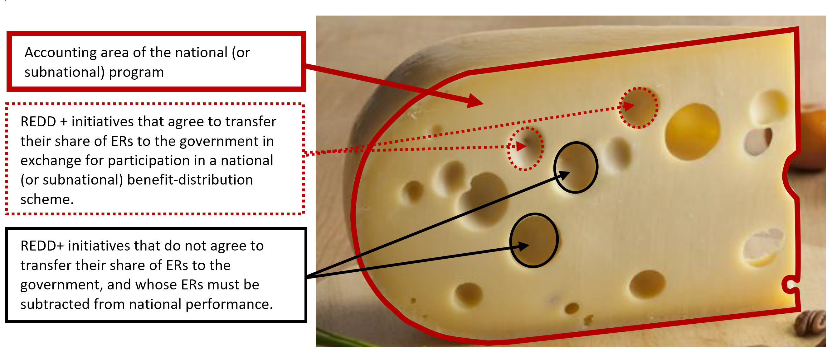 Emmental cheese is known for its holes but also for its good quality.  The price of the slice of cheese is determined by its weight, not by its volume.  This, perhaps, is an allegory for a nested system.  The presence of “gaps”, or independent projects generating Emission Reductions (that need to be subtracted from the national accounting), need not to imply a loss of environmental integrity or quality of the national program—just as holes in the cheese do not imply poor quality of the product.