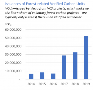 Over the past decade, donor governments have paid for over 330 million tons of CO2 “results” from forest countries.  Most of this (over 260 million tons) have been for Brazil’s reductions in emissions from deforestation, with the remaining purchases of around 70  million tons from six other countries.  Such results-based payments have been for government-led national (or subnational) programs designed to reduce deforestation, with payments contingent on quantified performance. More recently, purchases of project-based forest carbon credits by the private sector have been rising rapidly (see “Issuances of Forest-related Verified Carbon Units,” below), sourced from a wide range of countries.  New pledges by corporate players to offset emissions using ‘nature-based’ credits suggest this market will continue to grow.