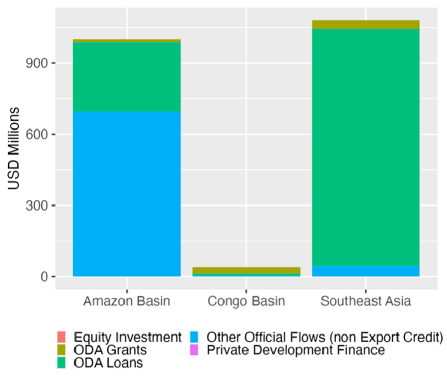 Figure 3 – Finance targeting two forestry-related sectors (Forestry and general environmental protection sectors) received by three high-forest regions between 2017 and 2021. Source: OECD Creditor Reporting System (CRS) database.