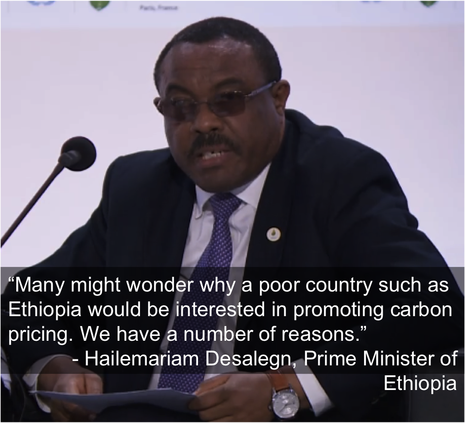 The subtext: Ethiopia is hoping it might be on the receiving end of funds raised through carbon pricing initiatives globally, and Desalegn noted that “we have amply opportunities in our forests and land to absorb a substantial amount of carbon” – a not-so-subtle shout-out to REDD+ (Reducing Emissions from Deforestation and forest Degradation) finance. But for the Prime Minister, carbon pricing is also about economic efficiency, since vulnerable countries have an interest in seeing clean energy technologies deployed as quickly as possible.