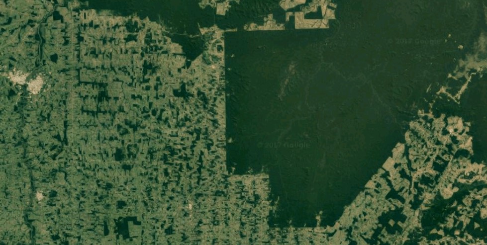 The Paiter Surui’s territory, the Sete de Setembro. Within the territory, forests are largely intact, compared to the surrounding lands.
