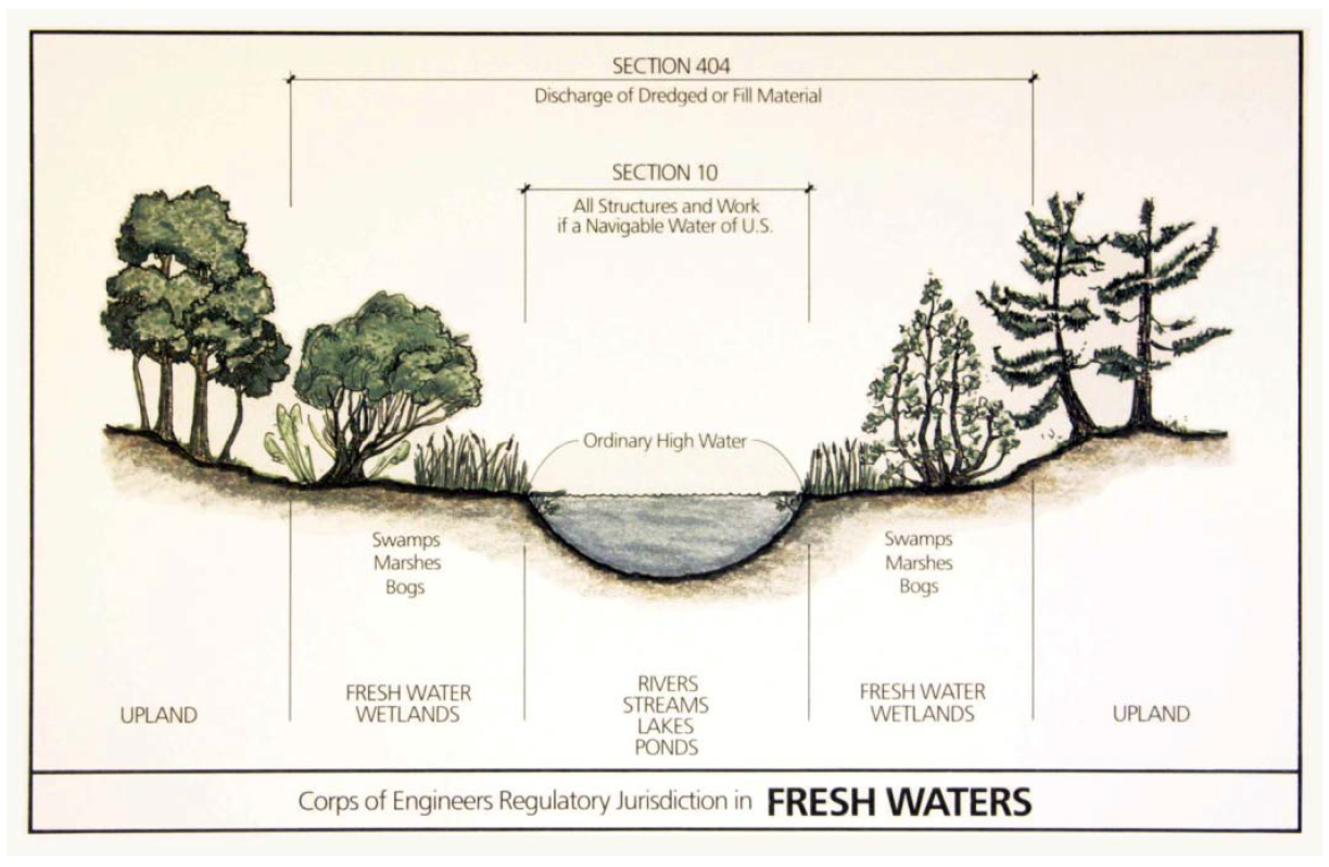 Under the Clean Water Act, the Army Corps of Engineers must regulate “waters of the United States”. Sometimes, as in this Army Corps illustration, those waters are easy to delineate. But not always.