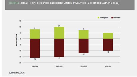 Although the headlines have been grim, and deforestation is increasing in some areas, such as the Amazon, overall deforestation rates globally have decreased in the last decade compared to the 1990s and the 2000s – from 15 million hectares per year in the period 2000-2010, to 10 million hectares per year in 2015-2020. Around half of the world’s forests are still relatively intact (49 percent) and 18 percent are legally protected, according to the FAO.