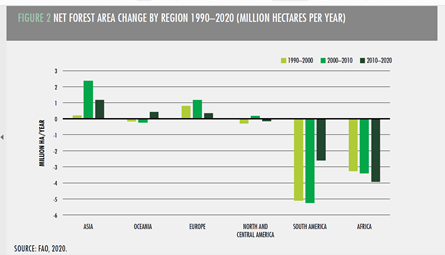 The FAO report further tells us that the geographical spread of deforestation is not equal, with net forest gains made in Asia, Europe and Oceania, and a decrease in deforestation in the last decade compared to the previous, in South America, Asia and Europe. Note that these are aggregated country level datasets, and deforestation rates will vary from country to country.