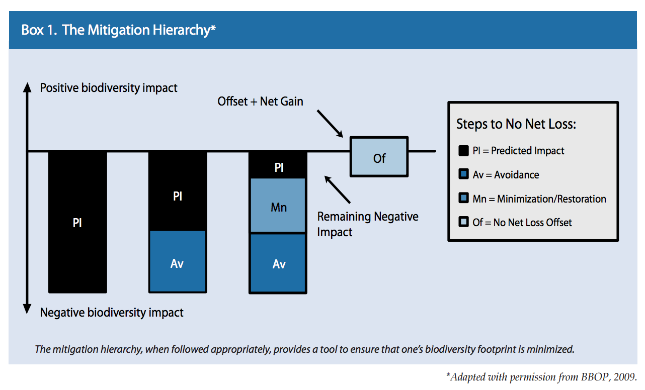Biodiversity markets include any payment for the protection, restoration, or management of biodiversity. Just a small sample includes: biodiversity offsets, conservation easements, certified biodiversity-friendly products and services, bioprospecting, payments for biodiversity management, hunting permits, and ecotourism. Biodiversity market mechanisms are increasingly structured around the ‘mitigation hierarchy’ which establishes that market-based tools should be used only after efforts have been made to (first) avoid, (second) minimize, and (third) mitigate negative impacts to biodiversity (Box 1). Compensatory mitigation is a spectrum of practices that range from rigorous and measurable biodiversity offsets to less direct efforts to compensate for impacts through financial donations and land protection.